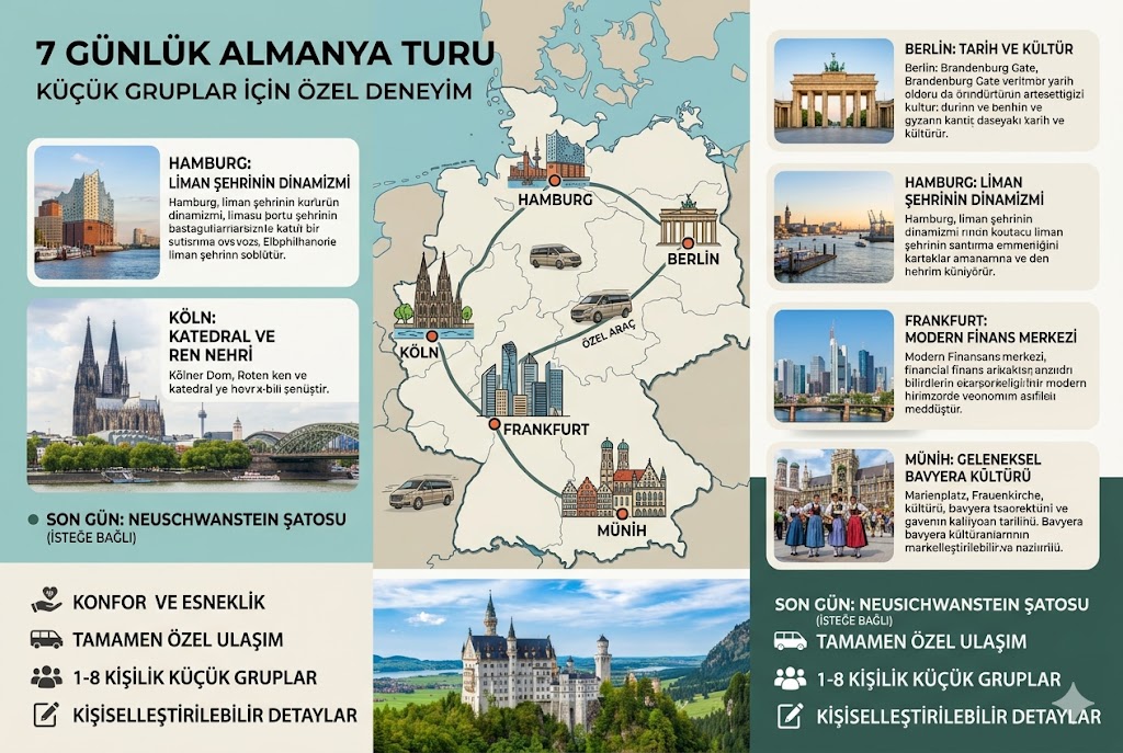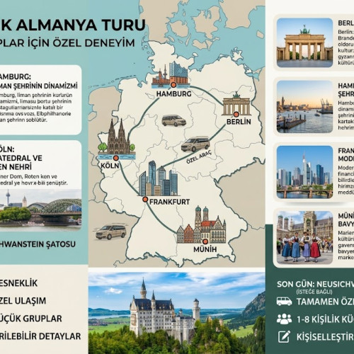 Küçük gruplara özel Almanya turu; konforlu ulaşım, esnek program, dengeli gezi planı ve yüksek hizmet kalitesi ile öne çıkar. Almanya’da gezilecek yerler arasında en popüler destinasyonları kapsayan bu tur, hem ilk kez gelenler hem de Almanya’yı daha derinlemesine keşfetmek isteyenler için ideal bir seçenektir.
