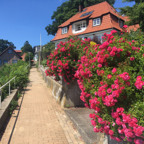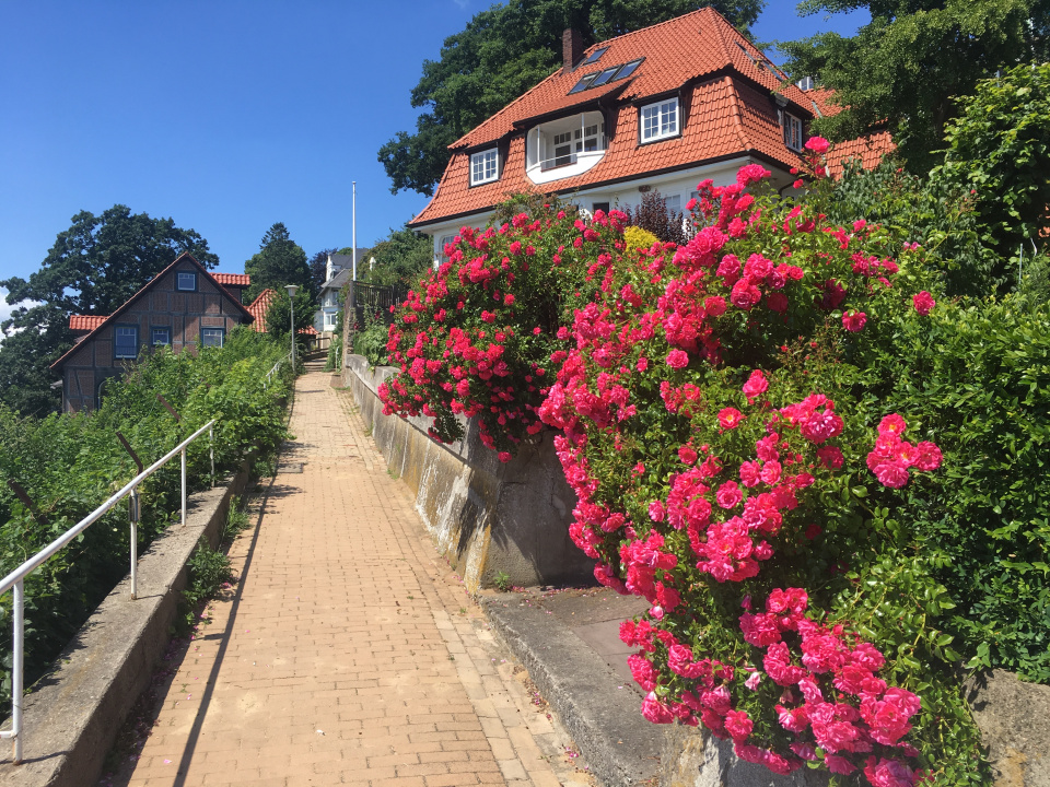 Die steilen Treppen und engen Wege unterhalb des Blankeneser Süllbergs bieten grandiose Blicke auf den breiten Elbestrom mit seinem regen Schiffsverkehr und inspirierte schon Künstler wie Horst Janssen, Eduard Bargheer oder Hans Leip. Da das Treppenviertel fast komplett autofrei ist, läßt es sich am Besten zu Fuß erkunden. Der Rundgang führt durch wunderschöne alte Parks, erzählt von der Geschichte Blankeneses als Fischerdorf und der Entwicklung zur Sommerfrische der Hamburger. Und unten am Fähranleger scheint das Meer schon zum Greifen nah.