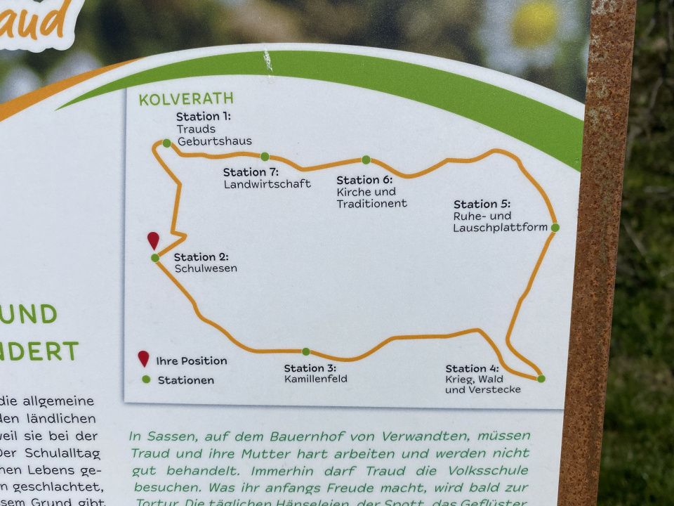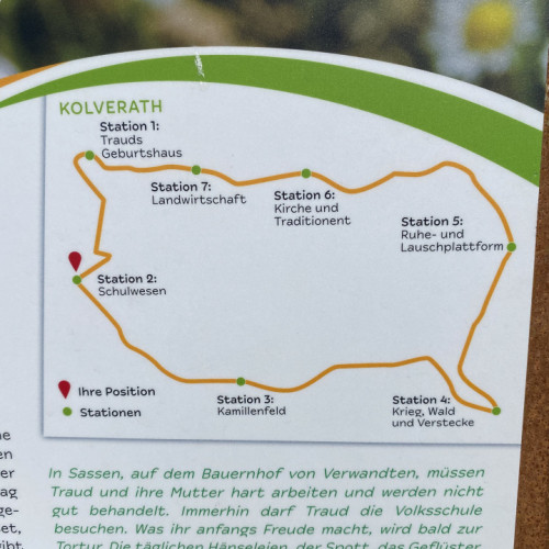 Über fünf Jahrzehnte lang zog die Kamillen-Traud als Wanderarbeiterin durch die Eifel - eine Frau, die mit Mut, Ausdauer und einem starken Willen ihren Weg ging. Die Themenführung erzählt ihre bewegende Geschichte vor dem Hintergrund des frühen 20. Jahrhunderts – einer Zeit geprägt von Armut, Kriegen, Inflation und dem Wandel durch die Industrialisierung. Dabei öffnet sich der Blick auf ein Leben am Rand der Gesellschaft – entbehrungsreich, aber voller Würde. Und schnell wird klar: Die Fragen nach Zusammenhalt, Gerechtigkeit und Selbstbestimmung, die ihr Leben prägten, sind heute aktueller denn je. Der barrierearme Themenweg rund um Kolverath lädt dazu ein, die Geschichte der Kamillen-Traud hautnah zu erleben – authentisch, berührend und für alle Generationen.