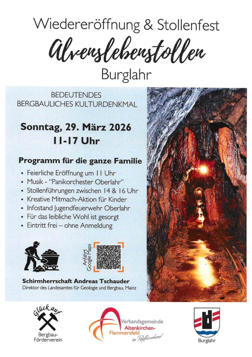 Nach umfangreicher Modernisierung und Aufwertung des Geländes darf der Alvenslebenstollen in Burglahr wieder für die Öffentlichkeit freigegeben werden. Das feiert die Verbandsgemeinde Altenkirchen-Flammersfeld mit einem Stollenfest am Sonntag, dem 29. März 2026 in der Zeit von 11:00 bis 17:00 Uhr am Alvenslebenstollen in Burglahr. Neben einem abwechslungsreichen Rahmenprogramm sind in der Zeit von 14:00 bis 16:00 Uhr mehrere Stollenführungen möglich. Kommen Sie gerne vorbei und erkunden mit uns zusammen den Wasserlösungsstollen der Grube Louise.