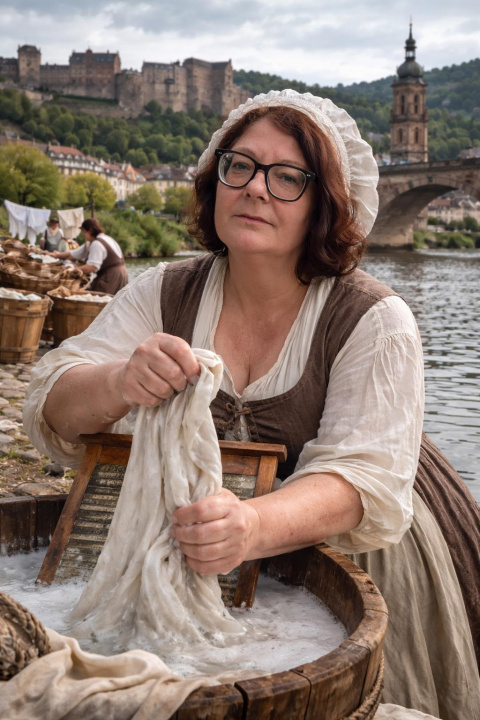 Wäschewaschen war früher harte Arbeit. es wurde mit Asche gewaschen, gerubbelt, geschlagen, gespült und gebleicht. Da bleibt zwischendurch doch Zeit für Klatsch und Tratsch. Das Waschweib Babett ist nicht nur mit allen Wassern gewaschen, sondern nimmt Sie mit auf einen sehr unterhaltsamen Spaziergang durch die Altstadt Heidelbergs. Sie erklärt Ihnen, wie in ihrer Zeit anonyme Alkoholiker aussahen, warum Unterhosen katholisch sind und welche Rolle die Kreuzritter bei der Badekultur spielen. Sie weiß, warum man Perücken trägt und was der Unterschied zwischen kreisrundem Haarausfall und eine Tonsur ist. Lassen Sie sich von ihr erklären, warum in Heidelberg Brezeln in Mauern geschlagen werden und was das Viagra des 17. Jahrhunderts ist
