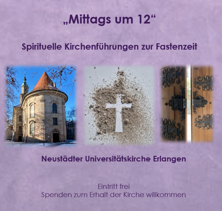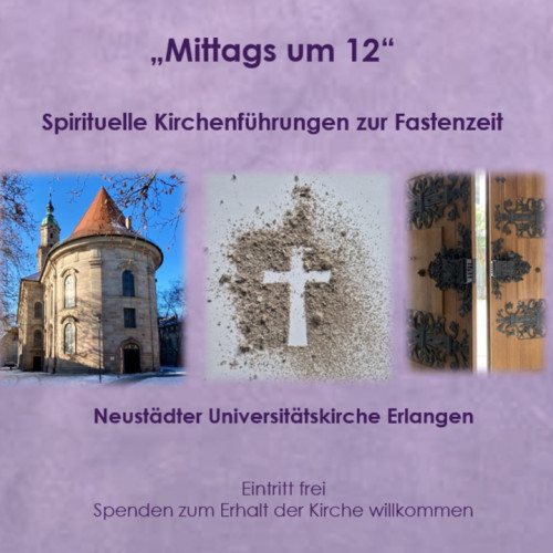 Sie erfahren interessante Bräuche und Besonderheiten, eingebettet in die Geschichte Erlangens und unserem Erlanger Juwel, der Neustädter Universitätskirche. Sie sind zu dieser Auftaktführung herzlich eingeladen, für ca. 30 Minuten bei Impulsen und Musik inne zu halten.