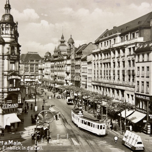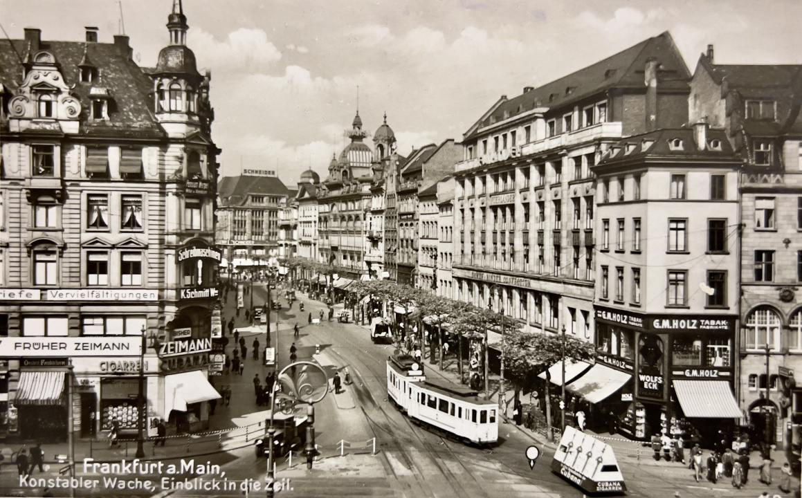 So charakterisiert das „Handbuch für Reisende auf dem Maine“ im Jahr 1843 die umsatzstärkste Einkaufsstraße Frankfurts. Von „Fürstenwohnungen“ und „Luxusschau“ möchte man angesichts der heutigen Zeil nicht mehr sprechen, aber die Straße steckt voller Geschichte und Geschichten, mit einer beachtlichen Karriere vom Schussfeld vor der Stadtmauer über Viehmarkt und Boulevard der Luxushotels bis hin zur Konsummeile. Bei einem Spaziergang sind Gegenwart und Vergangenheit der Straße unser Hauptthema.
