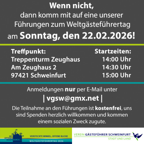 Unterwegs erfahren die Teilnehmenden spannende Geschichten, historische Hintergründe, besondere Details und unterhaltsame Anekdoten – über versteckte Winkel und kaum bekannte Besonderheiten Schweinfurts, die oft erst auf den zweiten Blick sichtbar werden.